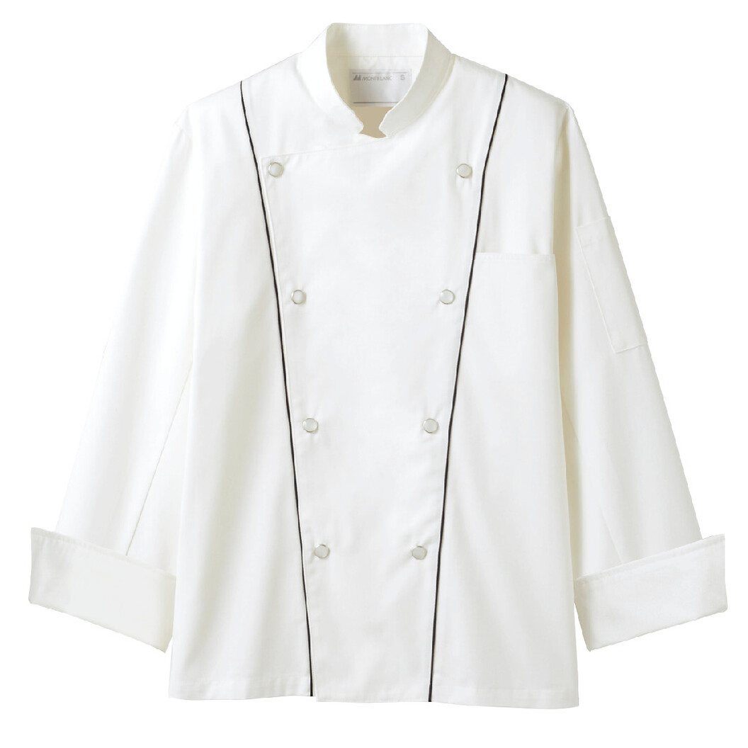 長袖で、パイピングがアクセントのコックコートです。 左胸にポケット、左袖にペンさしポケットがついています。 上質感のあるパール調のドットボタンで留め外しも便利です。