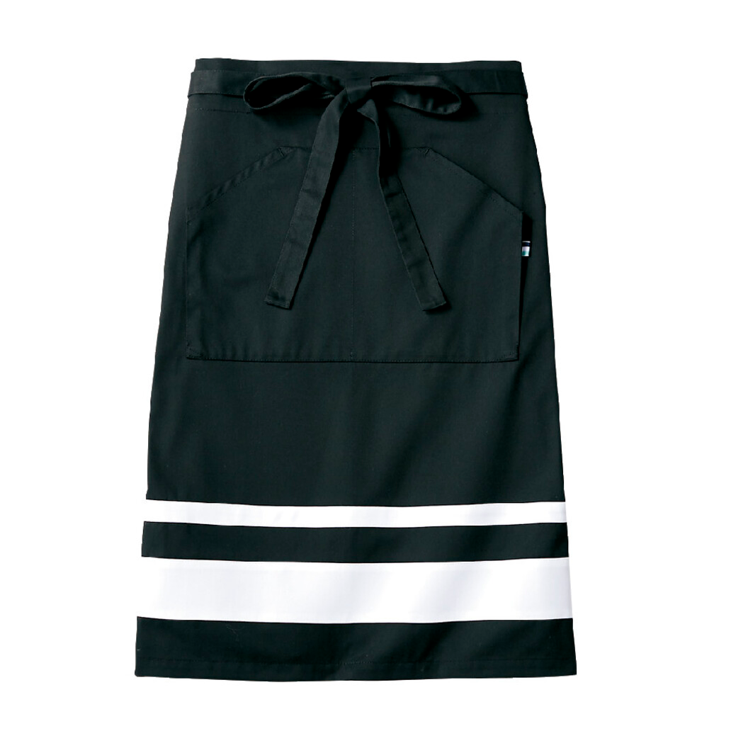 住商モンブラン×ワールドグループのコラボブランド「ブランシェ」の男女兼用サロンエプロンです。 ブラックに2本の白いラインを効かせて、おしゃれなマリンテイストに。 胸当てのないサロンタイプで、よりスタイリッシュな印象を演出します。 ベーシックなカラーだから、どんなアイテムとも好相性。 サイドのボタンホールから腰ひもを通す仕様で、腰周りがもたつかないスマート設計です。 フロントには大き目のポケット付き。もたつかず足さばきの良いひざ下丈です。