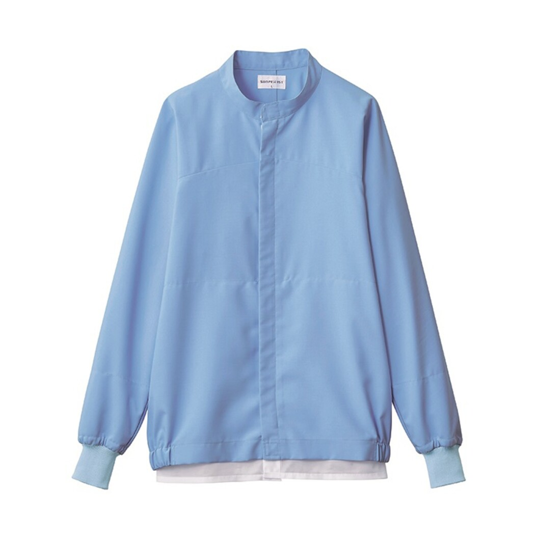 「動作感」「着用感」にこだわり、着る人のストレスを軽減した信州大学繊維学部とサンペックスストが共同開発した「動着やす衣」ジャンパー。暑さ対策に特化した「クールフリーデ(R)」素材を使用ており、ホワイト、サックス、グリーンの交差汚染対策を意識した3色展開です。首元はスナップボタン仕様、ケープのズレや浮きを防止。前開きはセミオートコイルファスナー、前立ては比翼仕立て、洗濯時のファスナーの損傷防止と作業時の安全性を高めてくれます。ウエストインナーはスナップボタン縦付け、縫い代はパイピング始末。本体の袖口はフライス、インナーの袖口は鹿の子ニット。