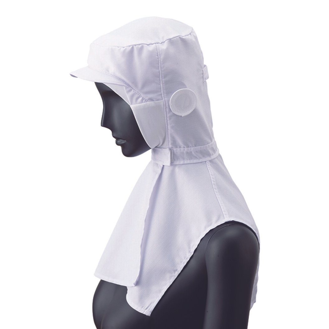 本体は接触冷感素材、額と頬に吸汗速乾ニットを使用し落髪・ズレ防止と汗止め効果あります。ツバとマスク掛けは織芯で洗濯可能、肩に立体ケープ。首はスナップボタン調整式、前方メガネ差し部分には伸縮性があり、隙間をガードします。後頭周りはマジックテープで調整可能です。