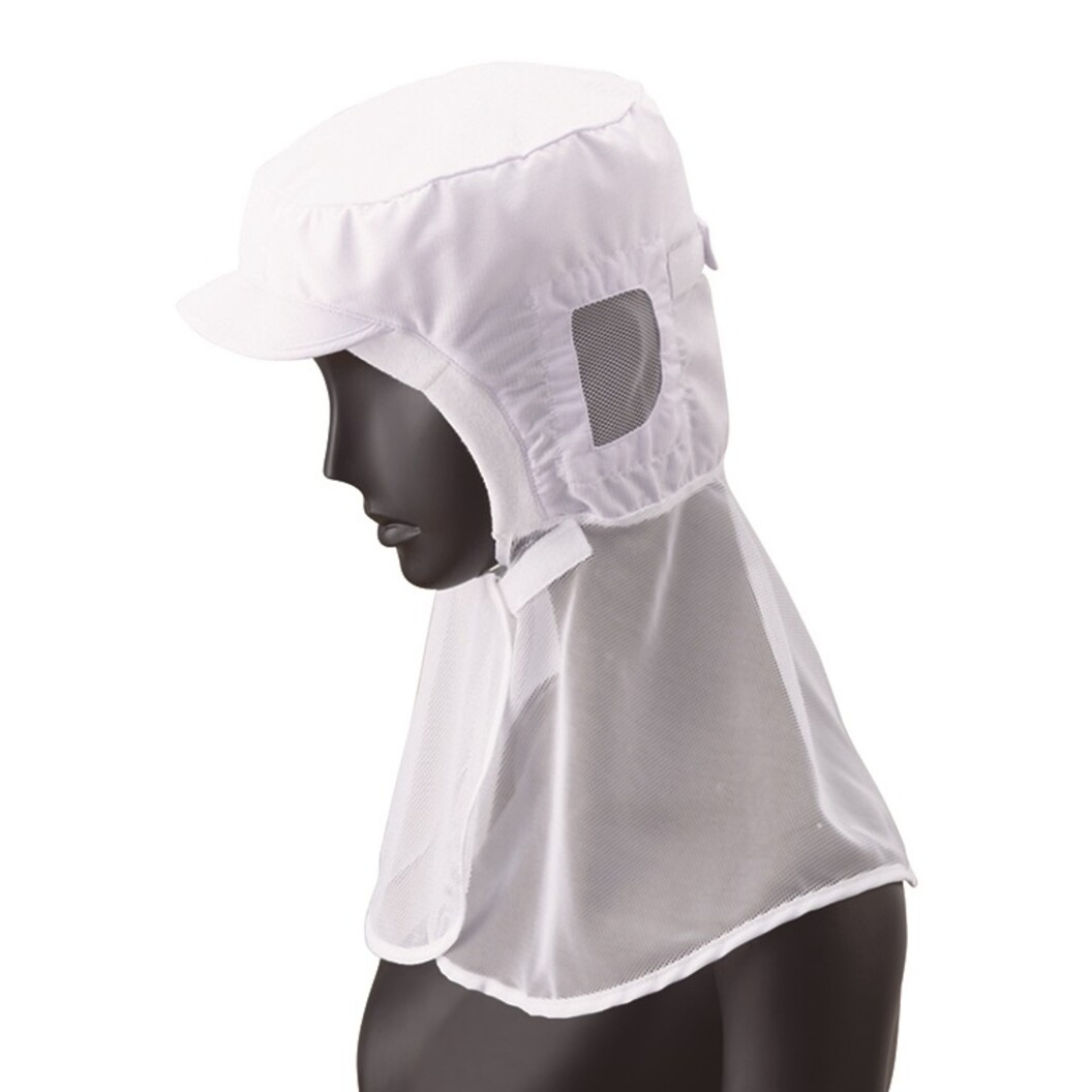 本体は接触冷感素材、ツバは洗濯耐久性の高い織芯を使用。額と頬はパイル素材、落髪・ズレ防止と汗止めの効果あり。耳部とケープは通気性の優れたメッシュ。前部留め、後頭周りはマジックテープでサイズ調整可能です。交差汚染に対応した、ホワイト、サックス、グリーンの3色展開です。