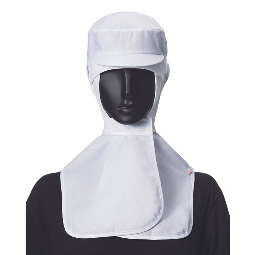 頭にフィットするハチマキタイプのフード。本体は接触冷感素材、ツバとマスク掛けは洗濯耐久性の高い織芯を使用。額と頬はニット素材で落髪・ズレ防止と汗止めの効果を発揮します。顎部分はスナップボタン仕様で顔のサイズに合わせた調整が可能。立体ケープで肩の負担を軽減し、動きやすさを考慮。メガネのズレを抑えるため、顔周りを覆うニットの幅を広げました。メガネの着脱がし易いように差込口が広めになっています。髪の長い女性のために、後頭部にゆとりをもたせた設計、サイズ調節できるスナップボタン式ストラップを採用。交差汚染に対応した、ホワイト、サックス、グリーンの3色展開です。