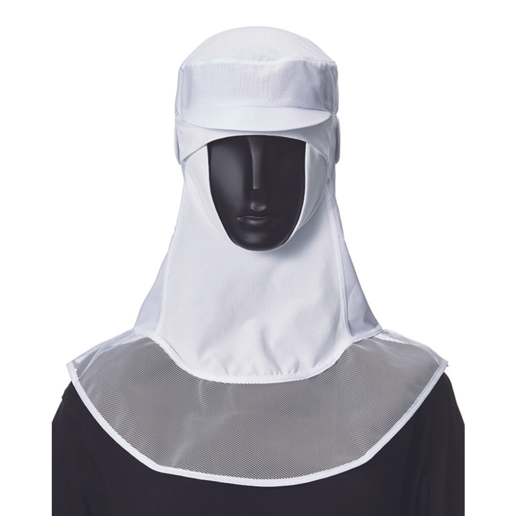 頭にフィットするツリガネタイプのフード。本体は接触冷感素材、ツバとマスク掛けは洗濯耐久性の高い織芯を使用。額と頬はニット素材で落髪・ズレ防止と汗止めの効果を発揮します。前留め部の調整スナップのないかぶりタイプ。隙間なく程よく密着した着用感で体毛落下防止に繋がる仕様。メガネのズレを抑えるため、顔周りを覆うニットの幅を広げました。メガネの着脱がし易いように差込口が広めになっています。髪の長い女性のために、後頭部にゆとりをもたせた設計、サイズ調節できるスナップボタン式ストラップを採用。交差汚染に対応。