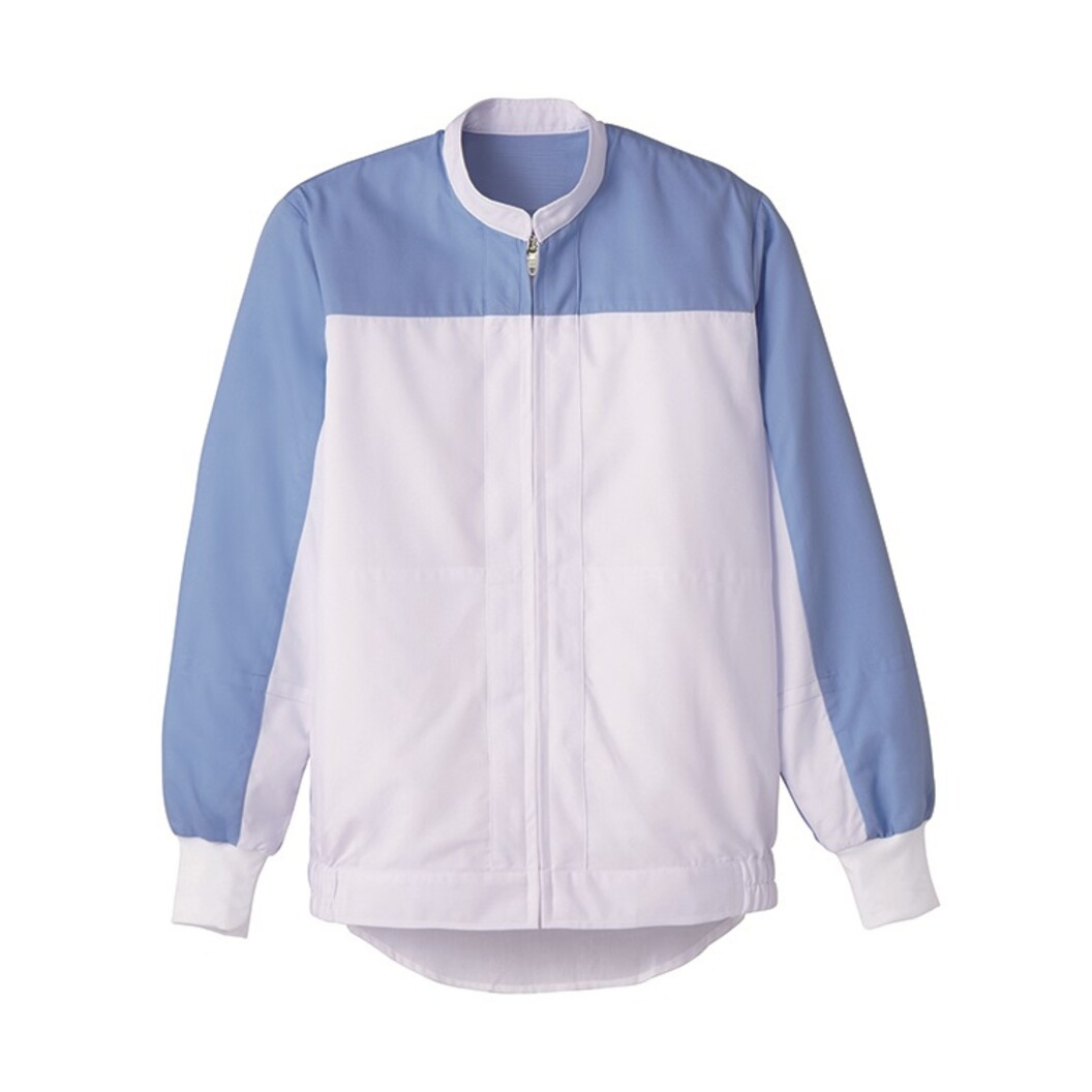 交差汚染対策を意識したホワイト×サックス、ホワイト×グリーンのバイカラー、2色展開の高温作業場向けジャンパーです。素材メーカー独自の繊編技術“点タッチドライ設計”を採用し、肌とウェアの接触面積を少なくすることで肌のベタつきを軽減します。異物混入を防ぐノーポケットタイプです。前開きはセミオートコイルファスナー、縫い代はパイピング始末、ウエストインナーはマジックテープ横付け。本体袖口はフライス、インナーの袖口はゴム入りです。