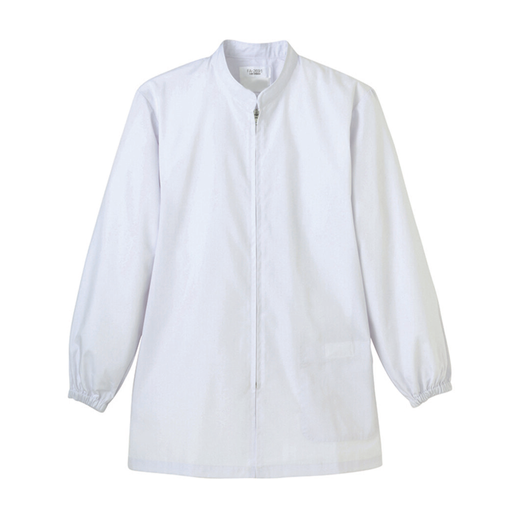 抗菌性と安全性に配慮した常温作業場向けスタンダードユニフォーム。軽作業に最適なスタンドカラーのコート型。前開きはセミオートコイルファスナー、本体袖口はゴム入りです。