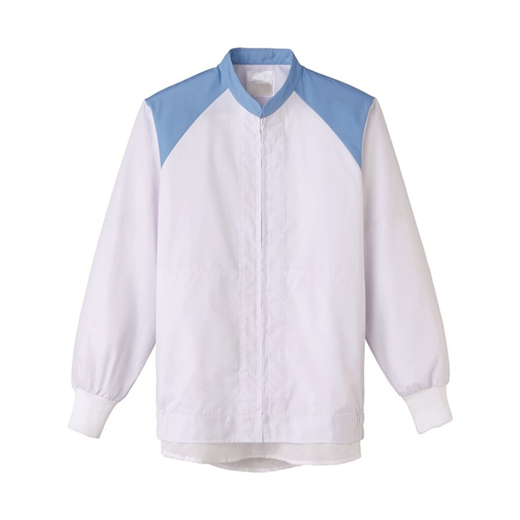 交差汚染対策を意識したホワイト×サックス、ホワイト×グリーン、ホワイト×ピンクのバイカラー、3色展開の常温作業場向けジャンパーです。軽作業に最適なスタンドカラーです。前開きはセミオートコイルファスナー、体毛落下防止機能を備えた異物混入対策仕様、ウエストインナーはマジックテープ横付け。本体袖口はフライス、インナーの袖口はゴム入り、ノーポケット仕様です。