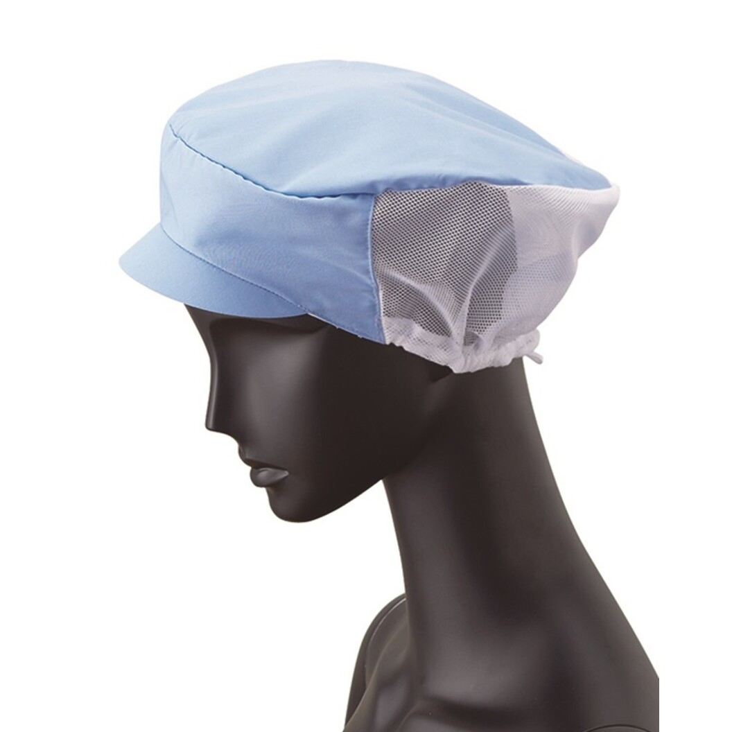 視界の良い額の狭いパターンと短いツバ。ツバは洗濯に強い織芯入り。後方はメッシュで通気性を確保。サイズを広い範囲で調整できる引き出しゴム式です。交差汚染に対応した、ホワイト、サックス、ピンクの3色展開です。
