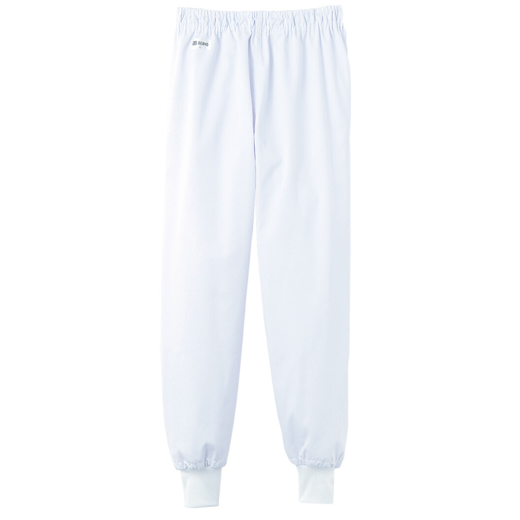 異物混入対策仕様のスタンダードの常温作業場向けホッピングパンツ。ファスナー、ポケットがないタイプで異物落下を軽減します。ウエストは総ゴムでゴム取替え口があり、ウエスト調節用の共紐入り、本体裾はフライス仕様です。縫い代は巻い伏せ縫いとなっています。