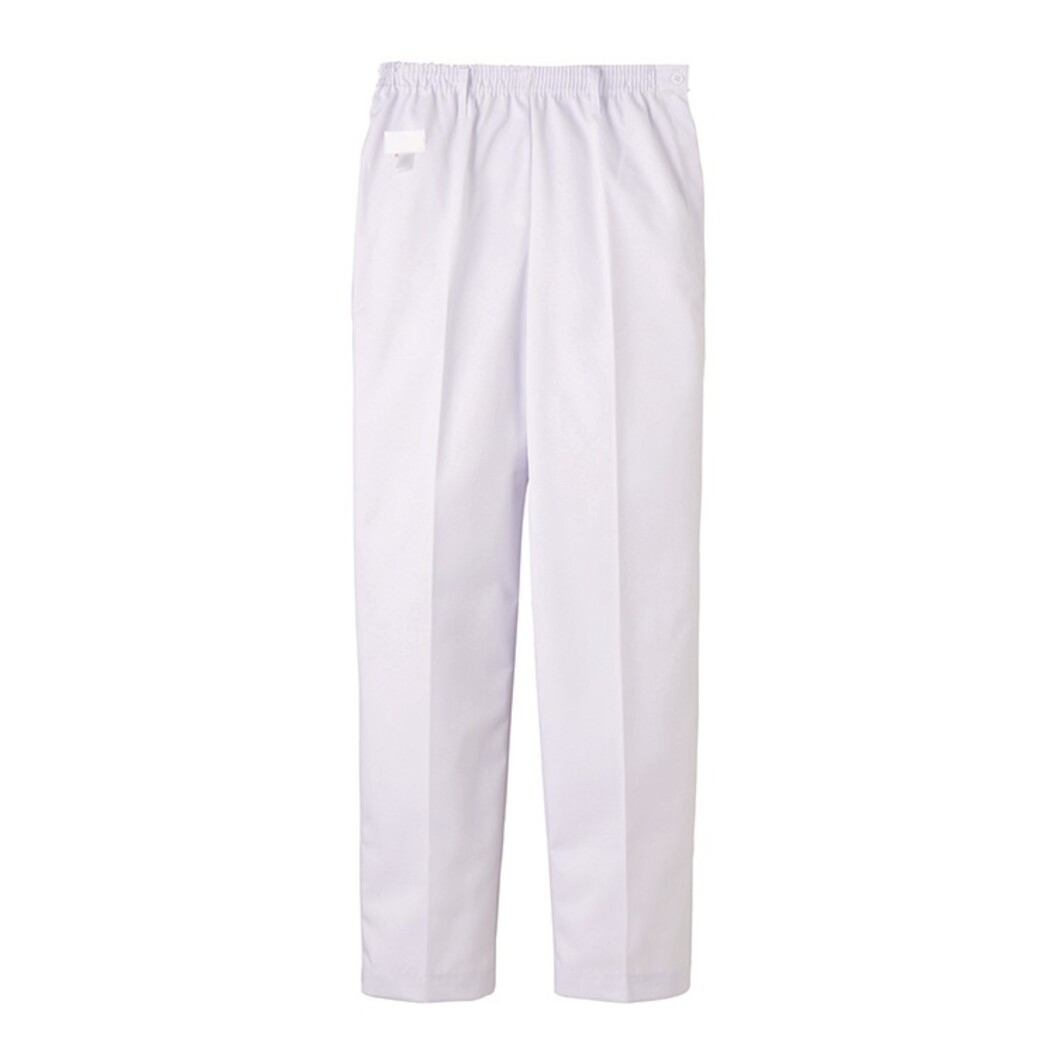 給食サービスにおすすめのストレートパンツ。ウエスト総ゴム、左脇開き金属ファスナー、右後外ポケット付き。ホワイト、サックスの2色展開。