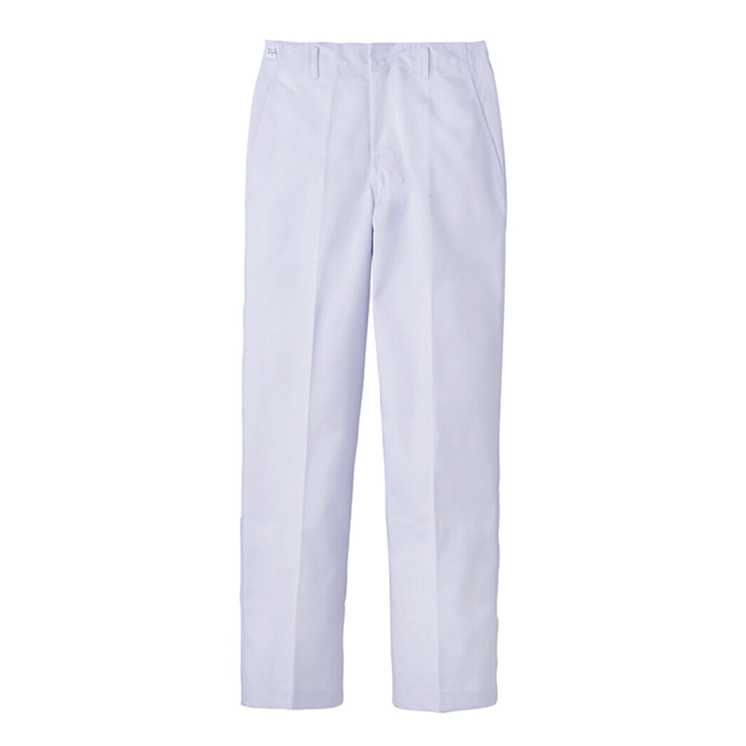 異物混入対策仕様のスタンダードの常温作業向けストレートパンツ。前開き金属ファスナー、両脇スラッシュ、右後片玉縁ポケット。インナー裾口ゴム入り、ホワイト、サックス、グリーンの3色展開です。
