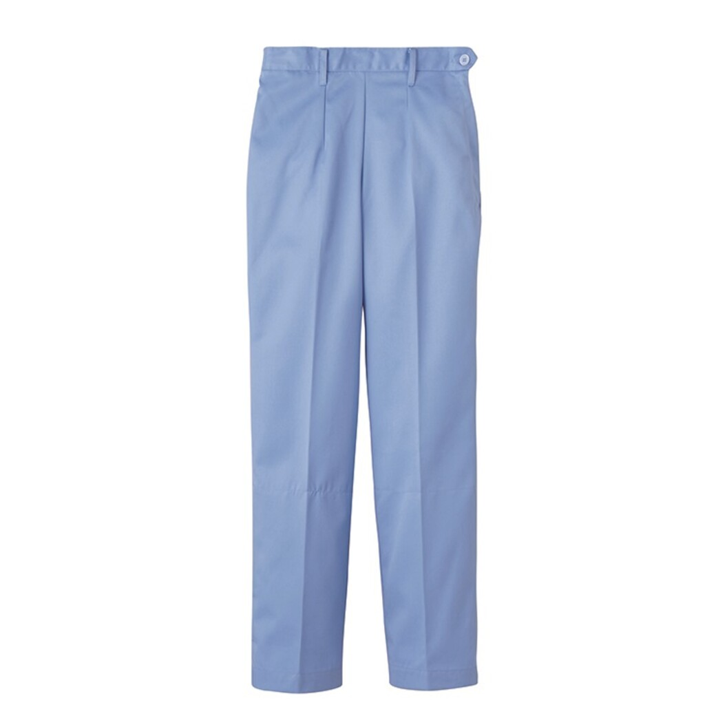 異物混入対策仕様のスタンダードの常温作業場向けストレートパンツ。ウエスト後ゴム、左脇開き金属ファスナー、右後外ポケット。インナー裾口ゴム入り、サックス、グリーンの2色展開です。