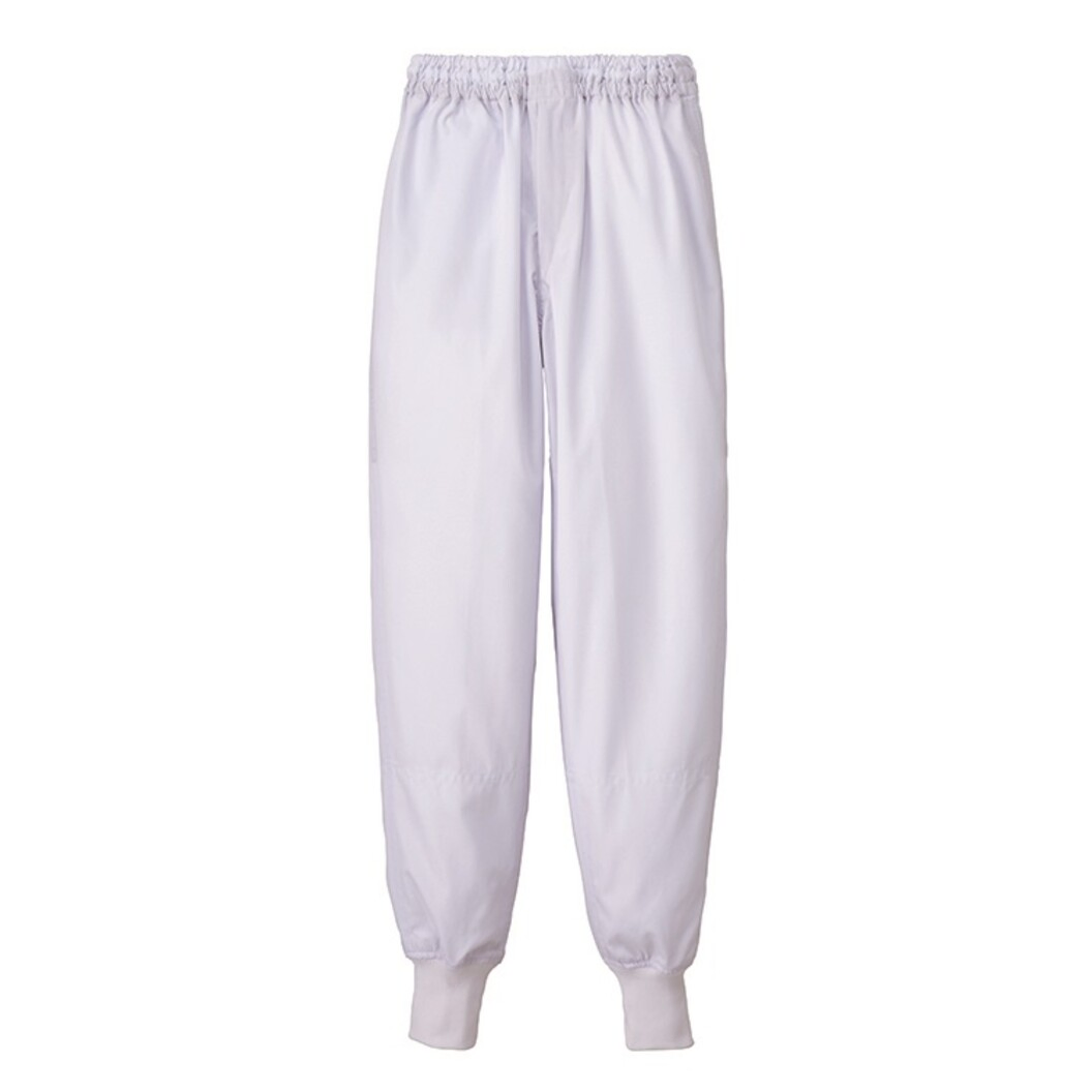 異物混入対策仕様のスタンダードの常温作業場向けホッピングパンツ。ウエスト総ゴム、共紐入り、ゴム取替え口、ファスナーなし。本体裾口はフライス、インナー裾口はゴム入り。右前ウエスト裏スナップボタン式キーポケット付き。縫い代は巻き伏せ縫い、ホワイト、サックス、グリーンの3色展開です。