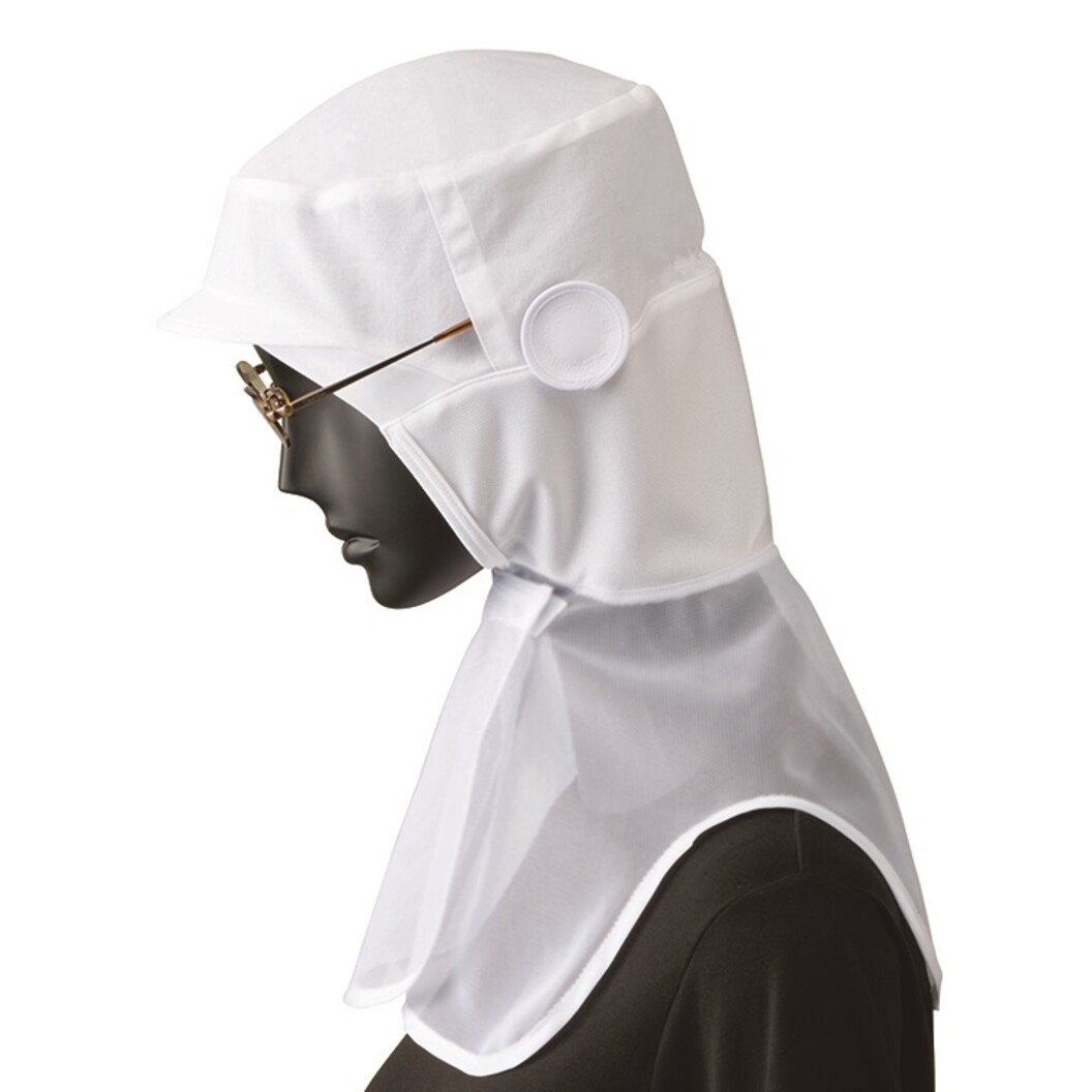 本体には涼感素材「シャミラン(R)」ツバは耐洗濯性の高い織芯。顔周りはニット素材で異物落下防止と汗止めの効果、素材は肌に優しい吸汗速乾のテクノファイン(R)。首周りは吸汗・速乾ニット素材。立体ケープは通気性と放熱性の高い快適なメッシュ素材。前合わせはスナップ調整式、後頭周りにはゴム入り。マスク掛けとスリット式メガネ差しを採用。