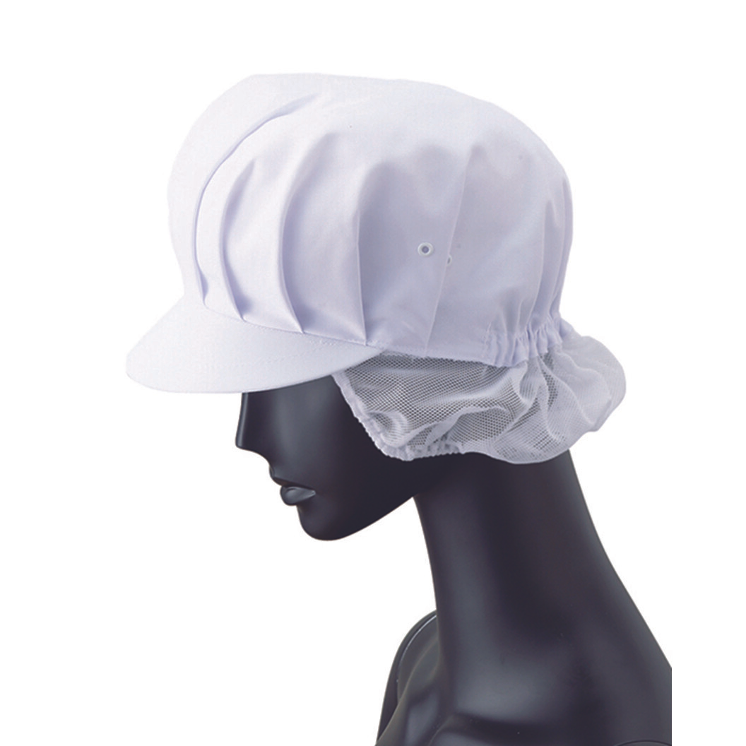 ケープ部分は通気性の良いメッシュを使用。ケープ裾はゴム絞り、ツバはポリエチレン芯です。