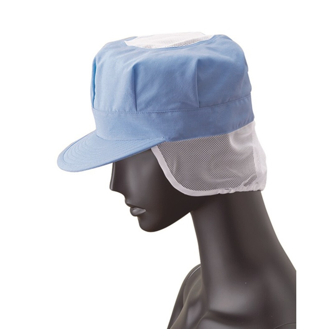 本体に涼感素材、ツバ芯に耐洗濯性の高い織芯を採用。快適な天井メッシュの通気穴。ゆったりしたパターンで後調整マジックテープ付き。ケープ部分は通気性の良いメッシュを採用しました。交差汚染に対応したホワイト、サックス、グリーンの3色展開です。