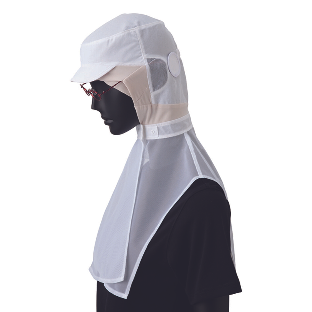 本体は涼感素材「シャミラン(R)」。ツバは耐洗濯性の高い織芯。顔周りはベージュのニット素材で異物落下防止と汗止めの効果、素材は肌に優しい吸汗速乾のテクノファイン(R)。ベージュにすることでファンデーションの付着も目立ちません。立体ケープは快適なメッシュ素材。前合わせはスナップ調整式、後頭周りには幅広ゴム入り。マスク掛けとはさみ込み式メガネ差しを採用。