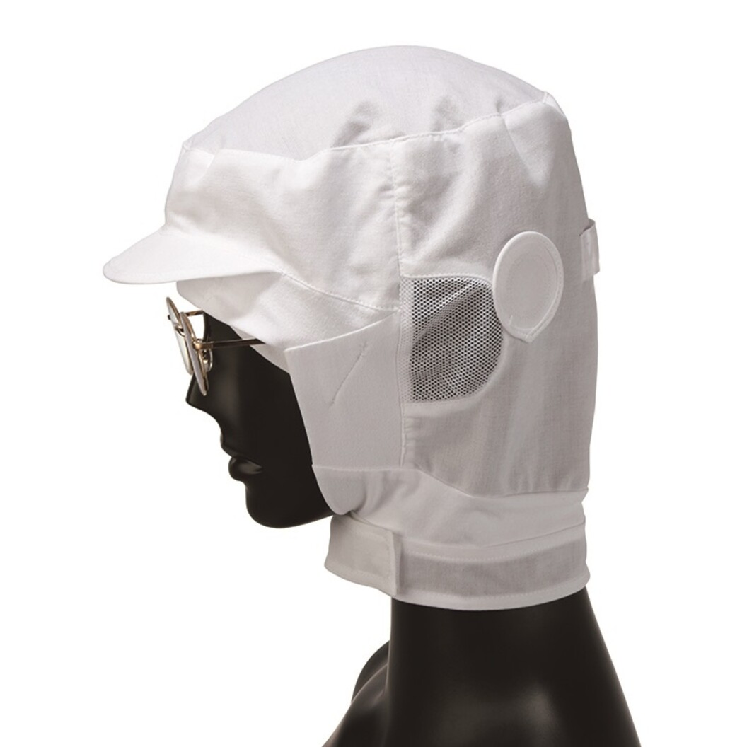 軽作業に適したショートフード。本体は通気性・放熱性に優れ快適な肌触りをキープする涼感素材「シャミラン(R)」額・頬・首は伸縮性の高いT400を使用、耳部分のメッシュは通気性と通音性を高めます。前部の留めと後頭周りはマジックテープで調整可能。ツバは洗濯耐久性の高い織芯を使用しています。マスクは円掛け式、メガネ差しははさみ込み式。交差汚染に対応したホワイト、サックス、グリーン、ピンクの4色展開です。