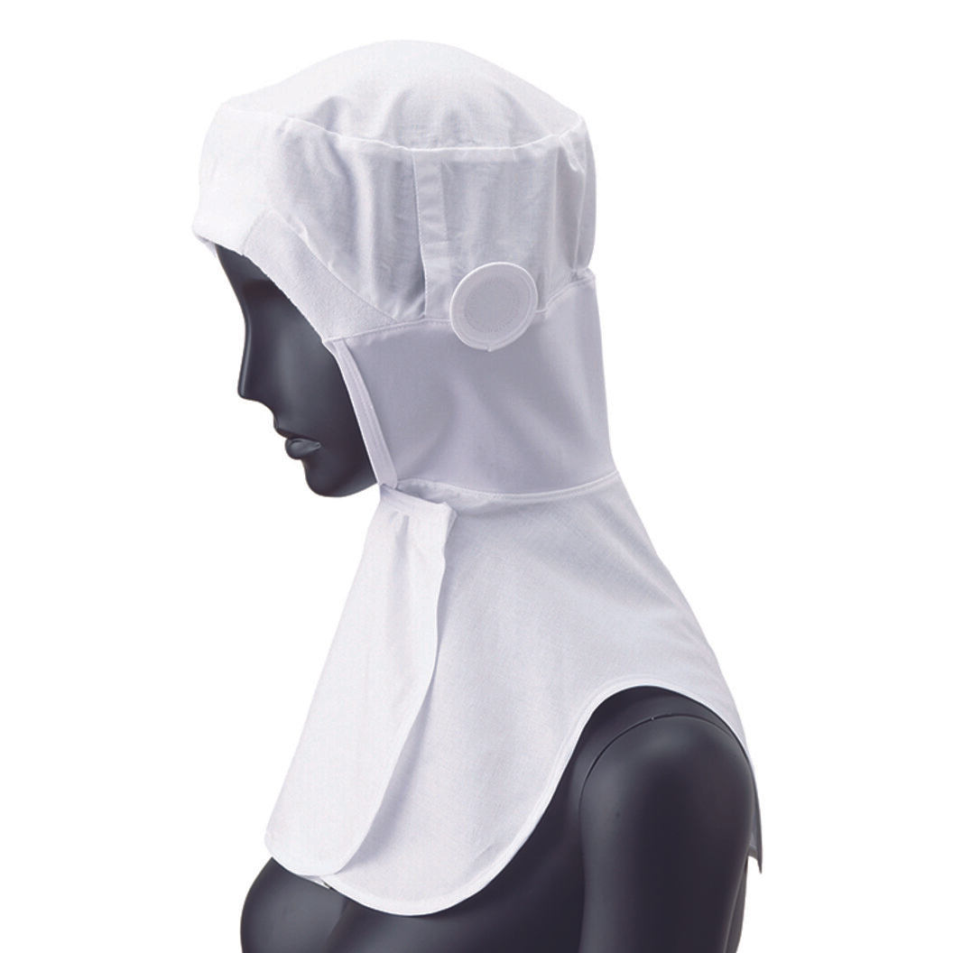 肌触りの良い綿素材を使用しているツバなしコットンフード。マスク掛けは洗濯耐久性の高い織芯、顔部分のパイルは落髪やズレ防止、汗止めの効果も発揮。後ゴム入り、首部分は伸縮性に優れたニット素材、前部分の留めはマジックテープ、スリット式のめがね差しを採用しています。