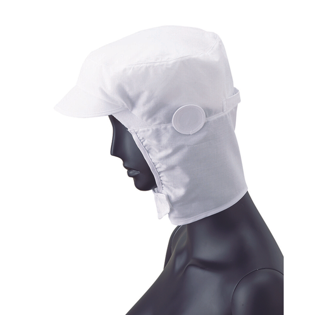 着用時の暑さを軽減する綿素材のショートフード。額はパイル素材で落髪・ズレ防止と汗止めの効果。ツバとマスク掛けは洗濯に耐える織芯を採用。前部留め、後頭周りはマジックテープで調整可能、マスクは円掛け式です。