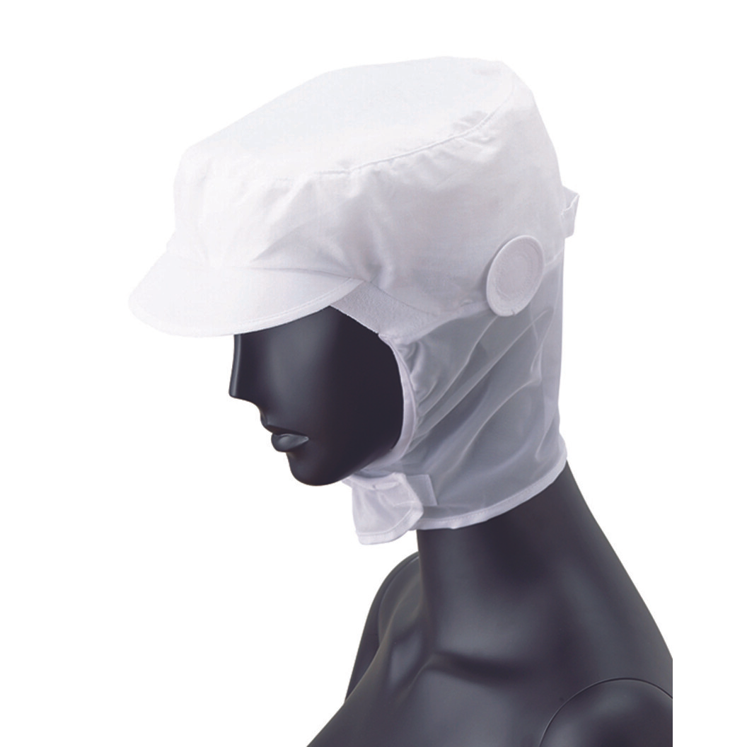 着用時の暑さを軽減する綿素材のショートフード。額はパイル素材で落髪・ズレ防止と汗止めの効果。ツバとマスク掛けは洗濯に耐える織芯を採用。頬と首周りは柔らかいトリコット素材、前部留め、後頭周りはマジックテープで調整可能、マスクは円掛け式です。