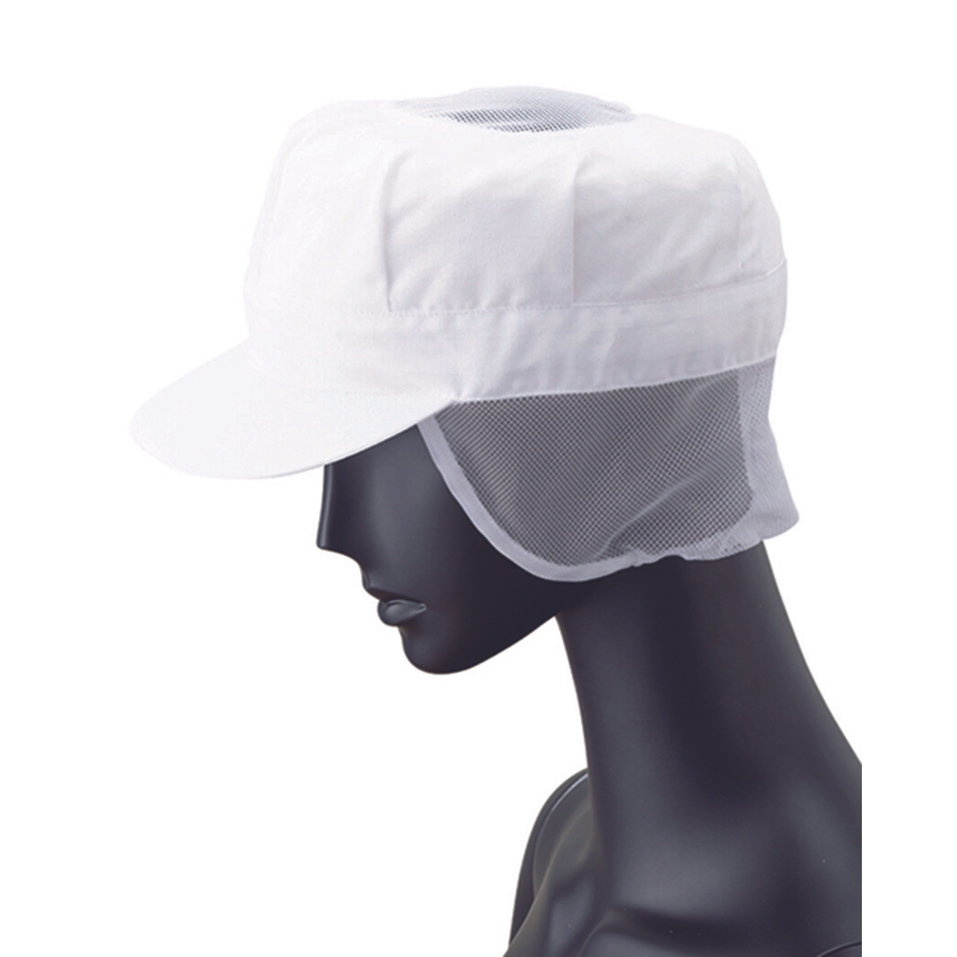 本体に涼感素材、天井とケープにシャリ感のあるメッシュ素材を使用し、暑さを軽減。ツバはポリエチレン芯を採用。ゆったりしたパターンで後調整マジックテープ付き。