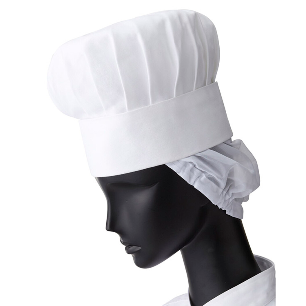 タック式の山高が、あらゆるシーンにマッチするコック帽。毛髪落下防止対策のメッシュ付き。