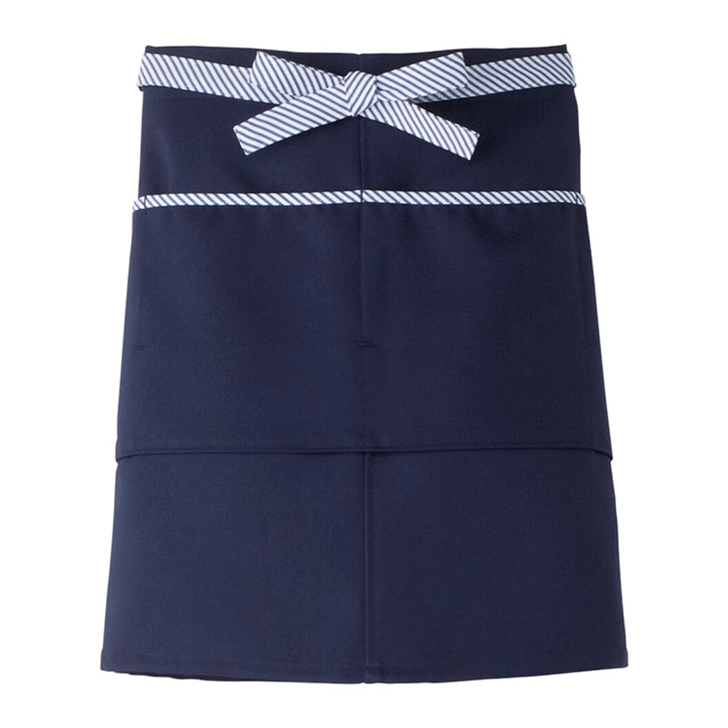 カジュアルでおしゃれな印象を大事にしながらも、機能的なポケットや防脱色機能を装備した、リボンがキュートな3タイプの実力派エプロン。ハードなホールワークも軽やかな印象に見栄えます。ショート丈の前掛は、ストライプの腰紐で存在感抜群。紐がずれないループ付き。