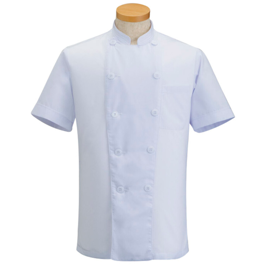 ニーズにあわせてバリエーション豊富に取り揃えた涼感コックコートシリーズ。外パッチポケット。尿素釦。