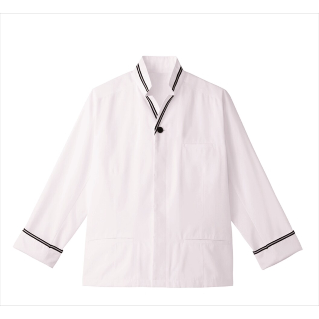 エプロンの上に出して着られるようショート丈に仕立てにしたスマートフォルムの男性用ショップコート。立体的な織り柄のブラックリボンテープ付き。