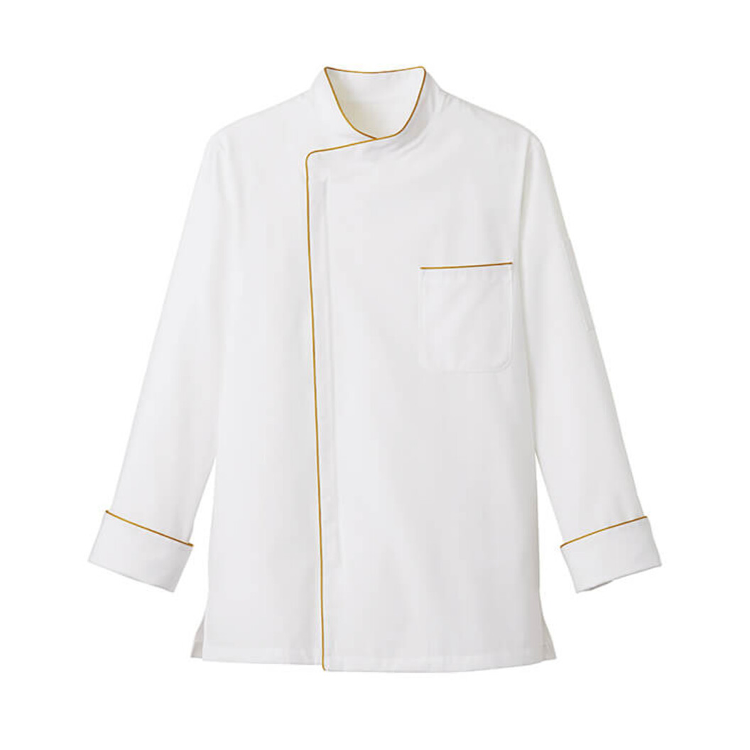 汎用性の高いコックコートをボタンレスにして、カラーパイピングでモダンに仕上げました。シンプルだから、様々なショップにマッチします。見た目はコックことらしさはそのままに、着脱性に便利なジップ仕立て。左腕に便利でお洒落なペン差しを装備しています。●男女兼用のSS、Sサイズはレディス用、Mサイズ以上はメンズ用。
