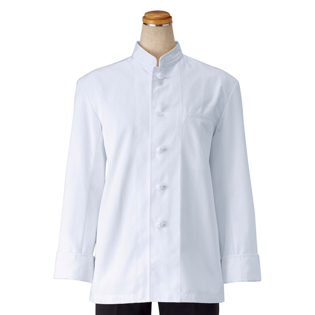 スタンドカラーにシングルの合わせのコックコート。洋食はもちろん、中華やインド、エスニックまで様々なシーンになじむ、汎用性の高さが人気です。平紐をしっかりと編み込んだ、本格仕様の組紐ボタンを使用しています。『フレッシュエリアR』は洗濯を繰り返しても抗菌力はほとんど落ちず、また、皮膚刺激も少ないため、安心して着用いただけます。左胸片玉縁ポケット付き。