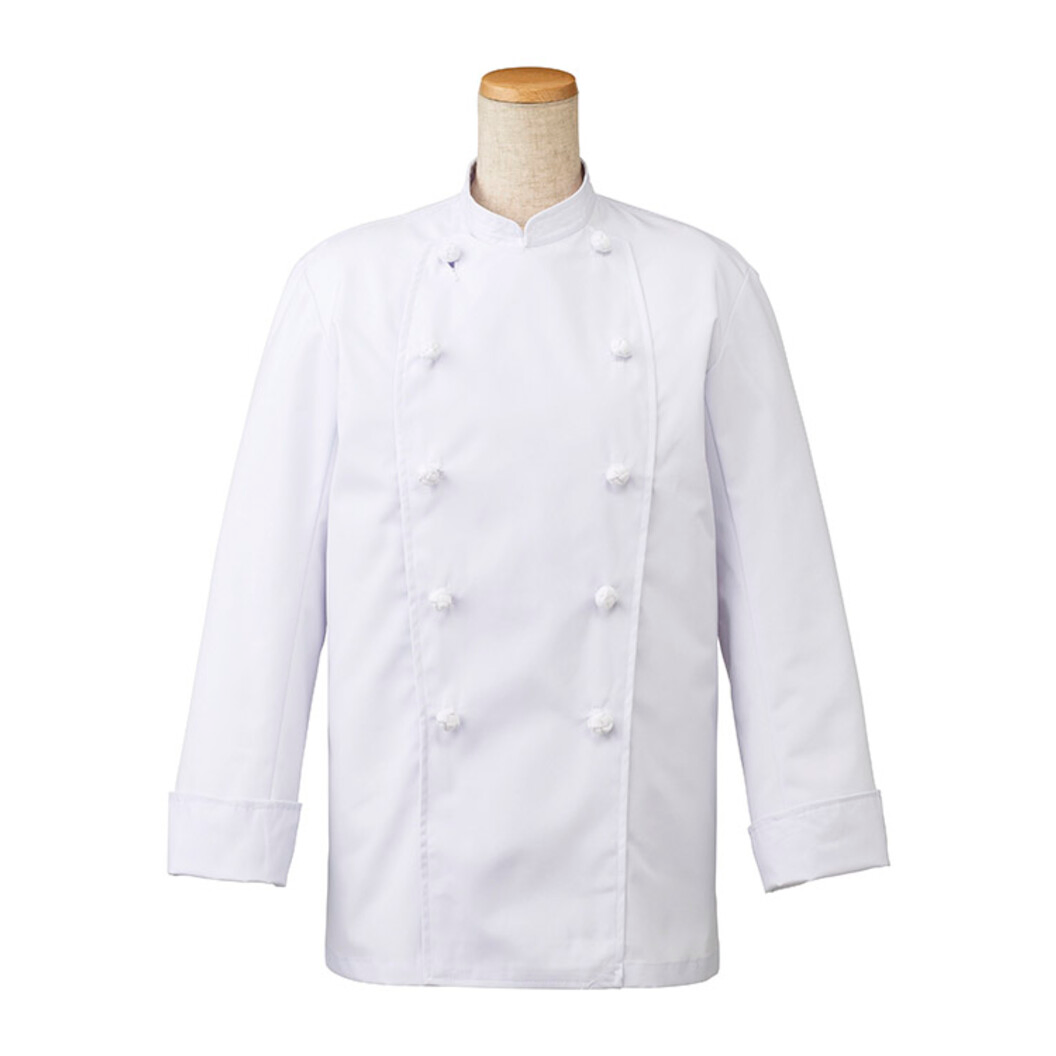 本格仕様のダブルブレステッドのコックコートは、7分袖や、素材、色などニーズに合わせてお選びいただけるよう、様々な種類をご用意しました。軽やかな作りで、厨房からホールまで対応する人気のコックコートです。本格的な組紐ボタンを装備しながら、実はファスナー仕様。着脱がらくらくです。●男女兼用のSS、Sサイズはレディス用、Mサイズ以上はメンズ用。