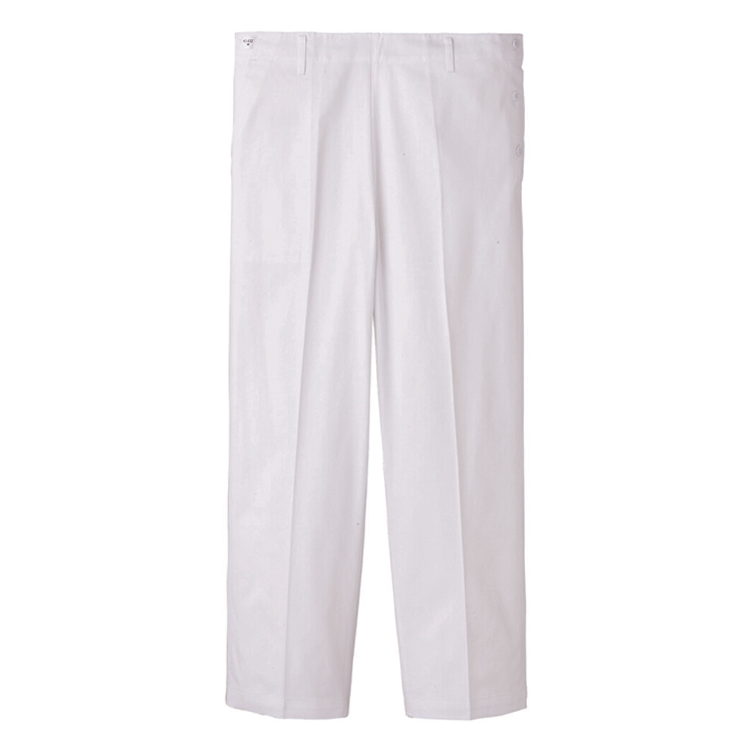 左脇ボタンタイプの定番ホワイトパンツ。後ウエストゴム入り、右脇スラッシュポケット付き。
