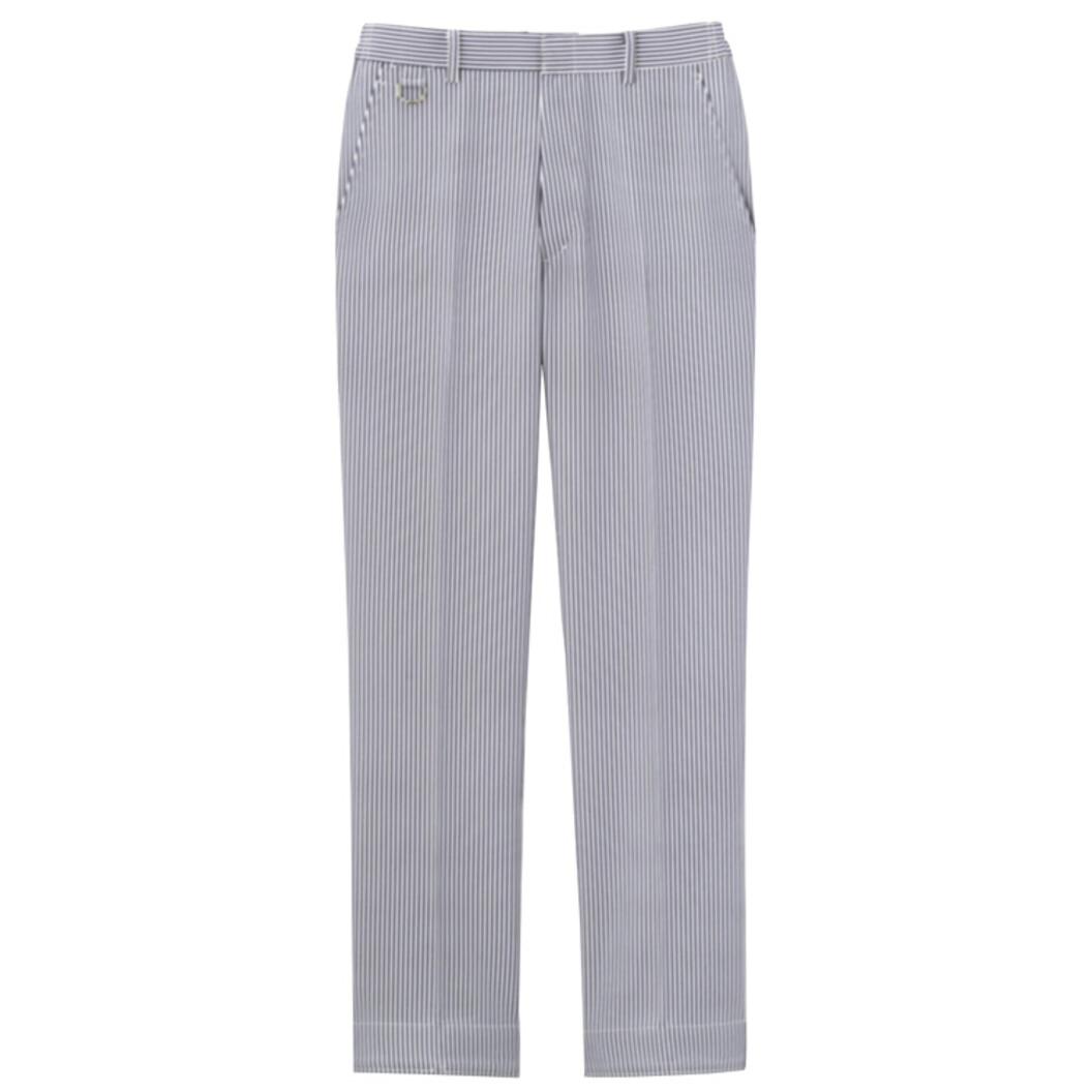 誰でも簡単に裾上げができるロールイン・パンツ。ノータックで両脇、両後にポケット付き、右前にDカン、両脇にはゴムが入っています。コックコートとの組み合わせで爽やかなスタイルです。