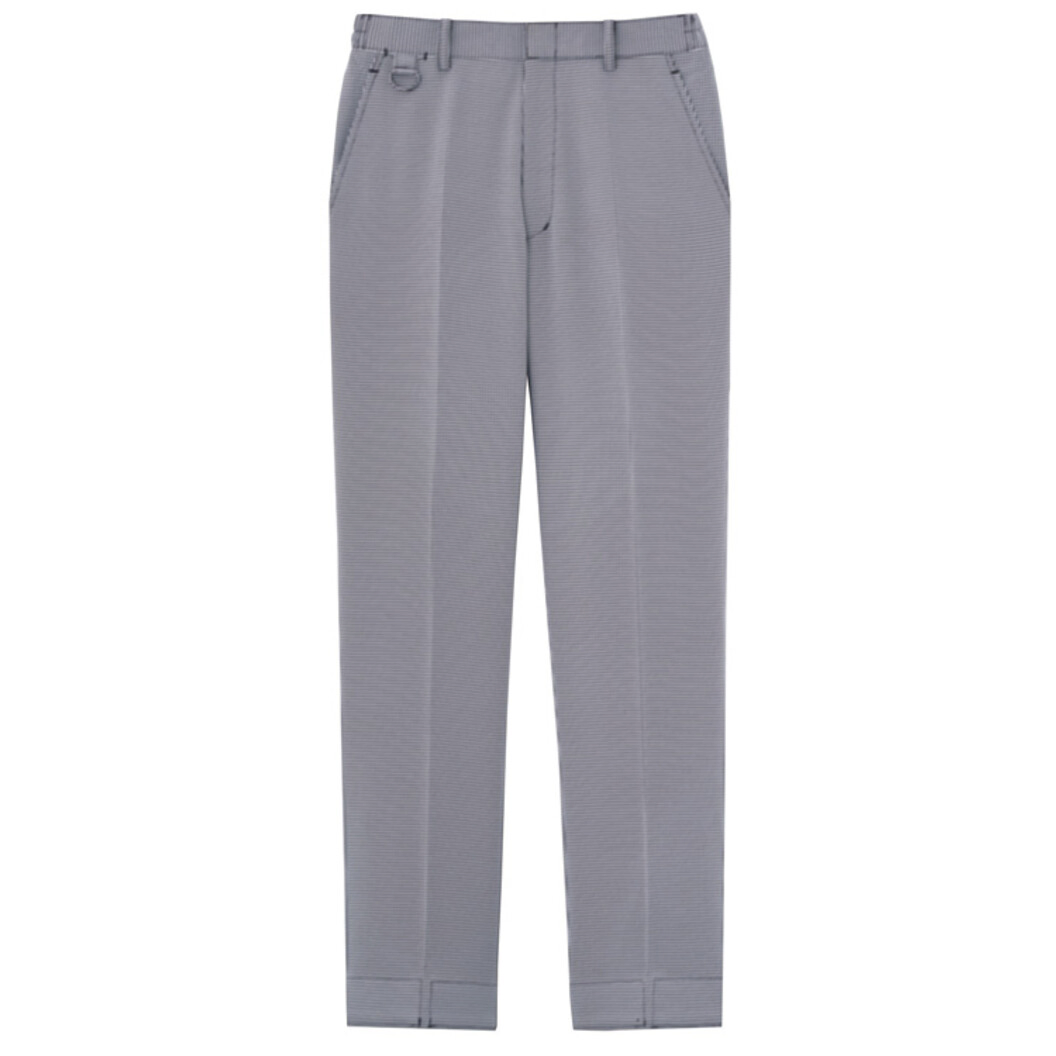 誰でも簡単に裾上げができるロールイン・パンツ。ノータックで両脇、両後にポケット付き、右前にDカン、両脇にはゴムが入っています。コックコートと組み合わせて知的な雰囲気になります。
