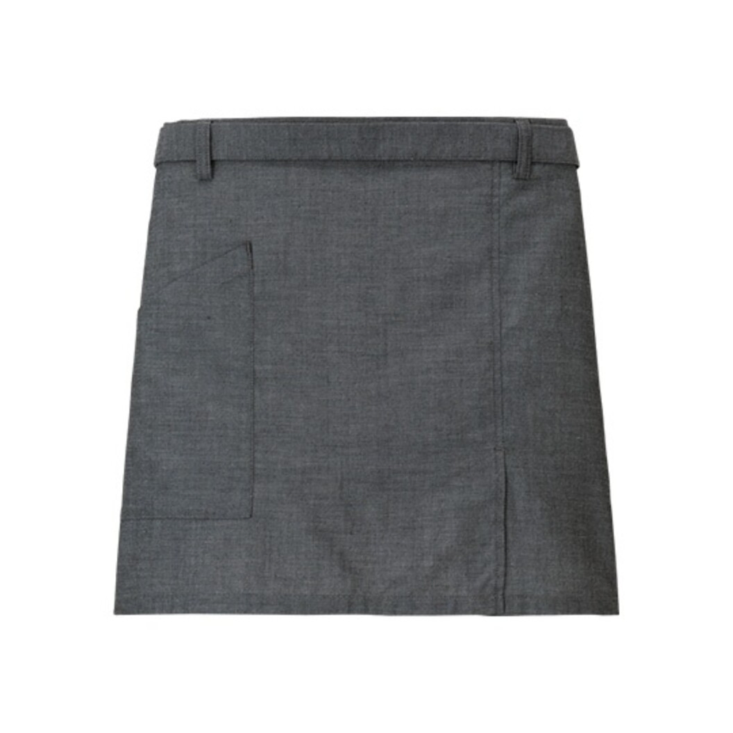 杢調グレーのサロンエプロン。バックポケットやサイドベントなど、動きの多いサービスシーンを配慮した工夫も嬉しい。