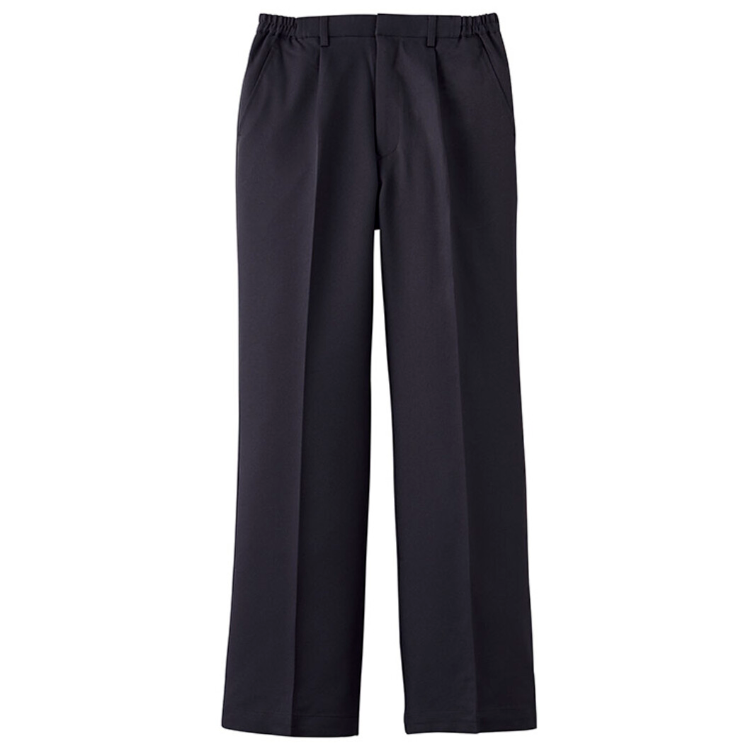 防脱色加工がうれしい男女兼用万能カジュアルパンツ。脇ゴム入。両脇スラッシュ、両後片玉縁ポケット付き。