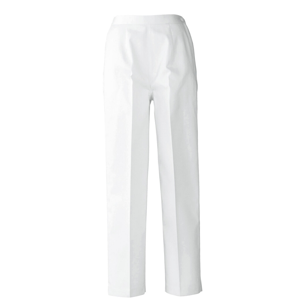 ポリエステル綿素材、女性用キャンティーンパンツです。制菌機能付き。制電糸入り。後ろゴムですので楽な着用感を得ることが出来ます。脇ファスナー開き、ボタン留め仕様。