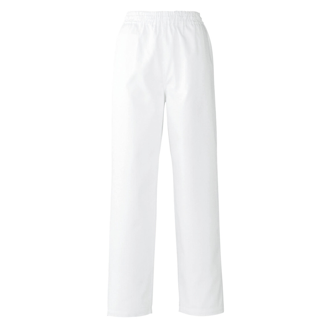 ツイル生地のゴムパンツ。ウエストには紐もあります。右身頃前に内ポケットあり。衛生白衣パンツとしては軽いスペックのものです。