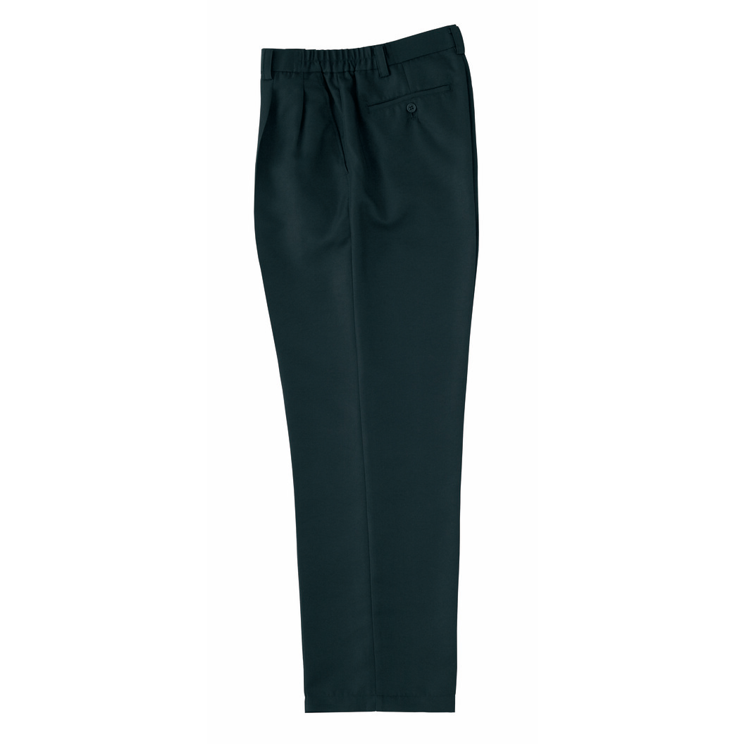 ホテル・レストランの色々なシーンで着用する黒パンツ。その男女兼用商品です。脇ゴム入り、ツータックのゆったりしたシルエットです。裾が上がっています。SS,Sサイズ、股下72cm、M~6L、股下78cm。同じデザインの裾上げされていないものもあります(WL14739)。SS82cm,S~6L92cmでフリーの状態になっています。