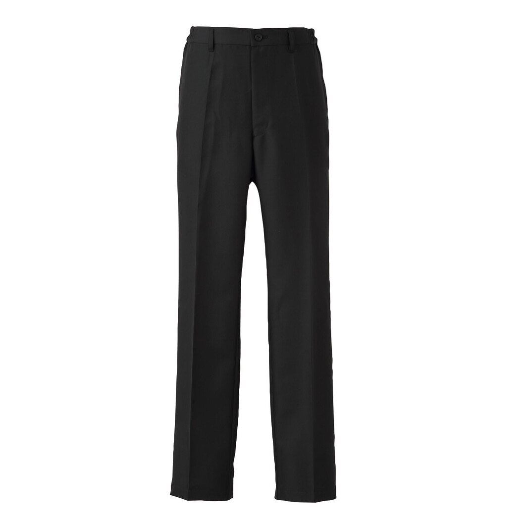 ホテル・レストランサービスの多くのシーンで着用する黒パンツの定番です。脇ゴム仕様。シルエットはテーパード、誰が着用してもスタイリッシュになるようなカッティングになっています。ポリエステル100%のギャバジン生地は高級感もあり、洗濯性も高く耐久性にも富んでいます。裾上げ加工済み商品です。股下はどのサイズも78cmで上がっています。