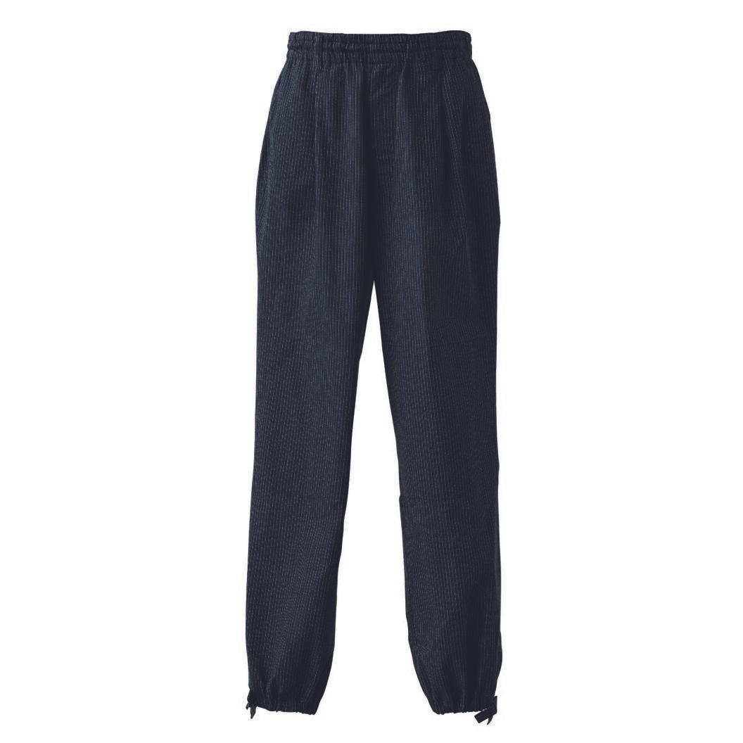 藍色ベースに先染めかすれ棒縞柄が特徴。同柄の作務衣やエプロン、三角巾がありますのでトータルでコーディネートすることができます。ウエストはゴムと紐入り。膝は裏に当て布がありますので丈夫です。裾は紐が入っていますので絞って着用します。丈直しが不要です。男女兼用。