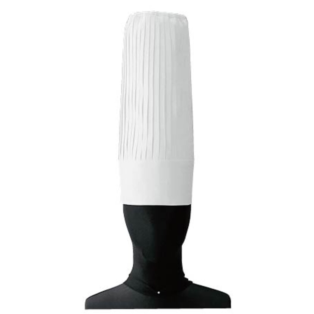 細布という生地は太い糸で平織りしたもので、寝具のシーツやカーテン、服の仮縫い時に使われています。その細布という生地でコック帽を作りました。カツラギより薄いが不織布より厚い適度な生地です。細かなプリーツ表現が美しく、丸天井がメッシュというデザインが特徴です。高さ40cmと当社の中で一番高いコック帽でもあります。コック帽の高さは地位を表します。