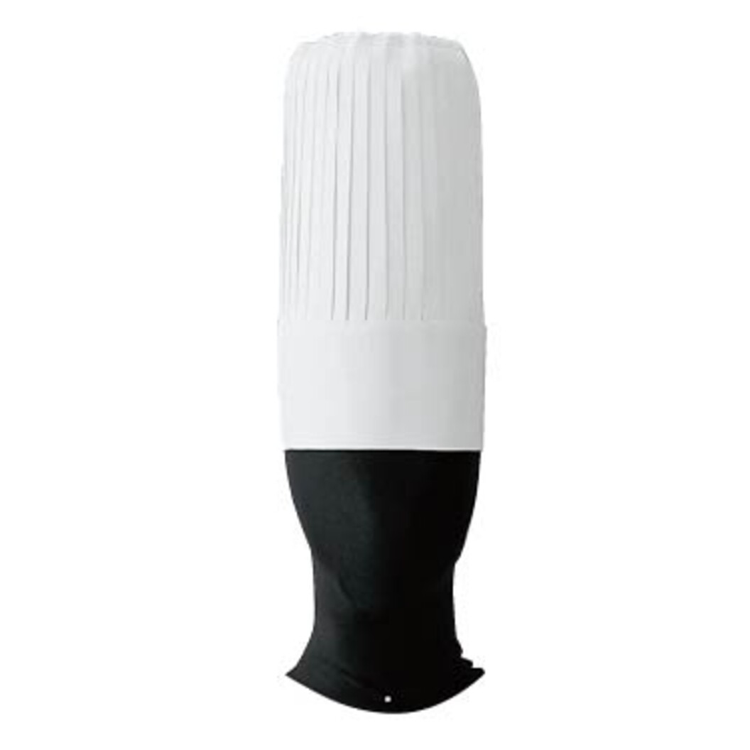 細布という生地は太い糸で平織りしたもので、寝具のシーツやカーテン、服の仮縫い時に使われています。その細布という生地でコック帽を作りました。カツラギより薄いが不織布より厚い適度な生地です。細かなプリーツ表現が美しく、丸天井がメッシュというデザインが特徴です。高さ30cm。コック帽の高さは地位を表します。
