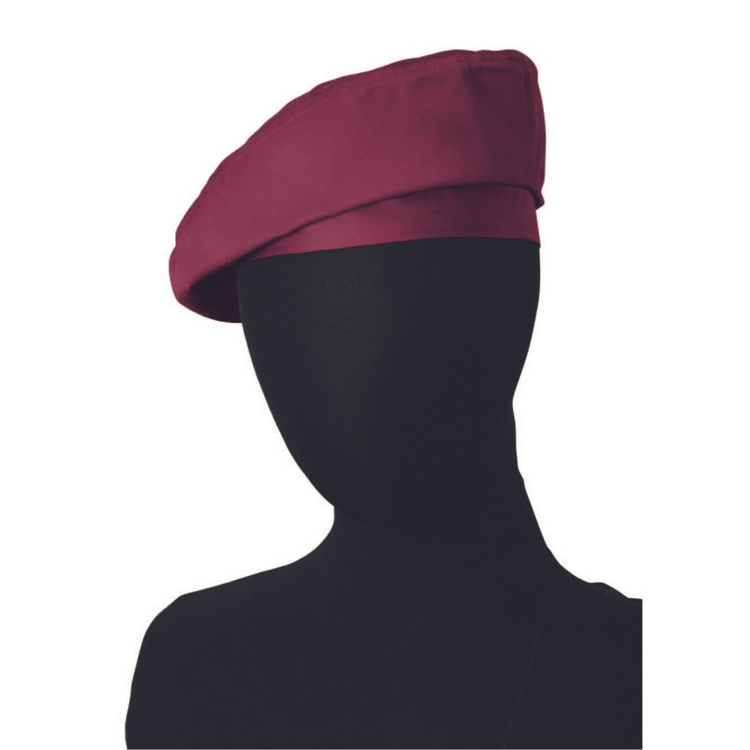 定番のベレー帽、ポリエステルと綿の混紡糸、色はワイン、グリーンの2色です。生地が硬めですのでかぶった際にトップをつぶしたり、わざと非対称にしたりすることなどが簡単です。サイズはマジックテープで調整出来る仕様です。同素材同色のエプロンが3デザイン、タイが1デザインありますので(CT2554,CT2555,CT2556,JY4716)、一緒に合わせることでよりまとまったコーディネートを作りだすことが出来ます。