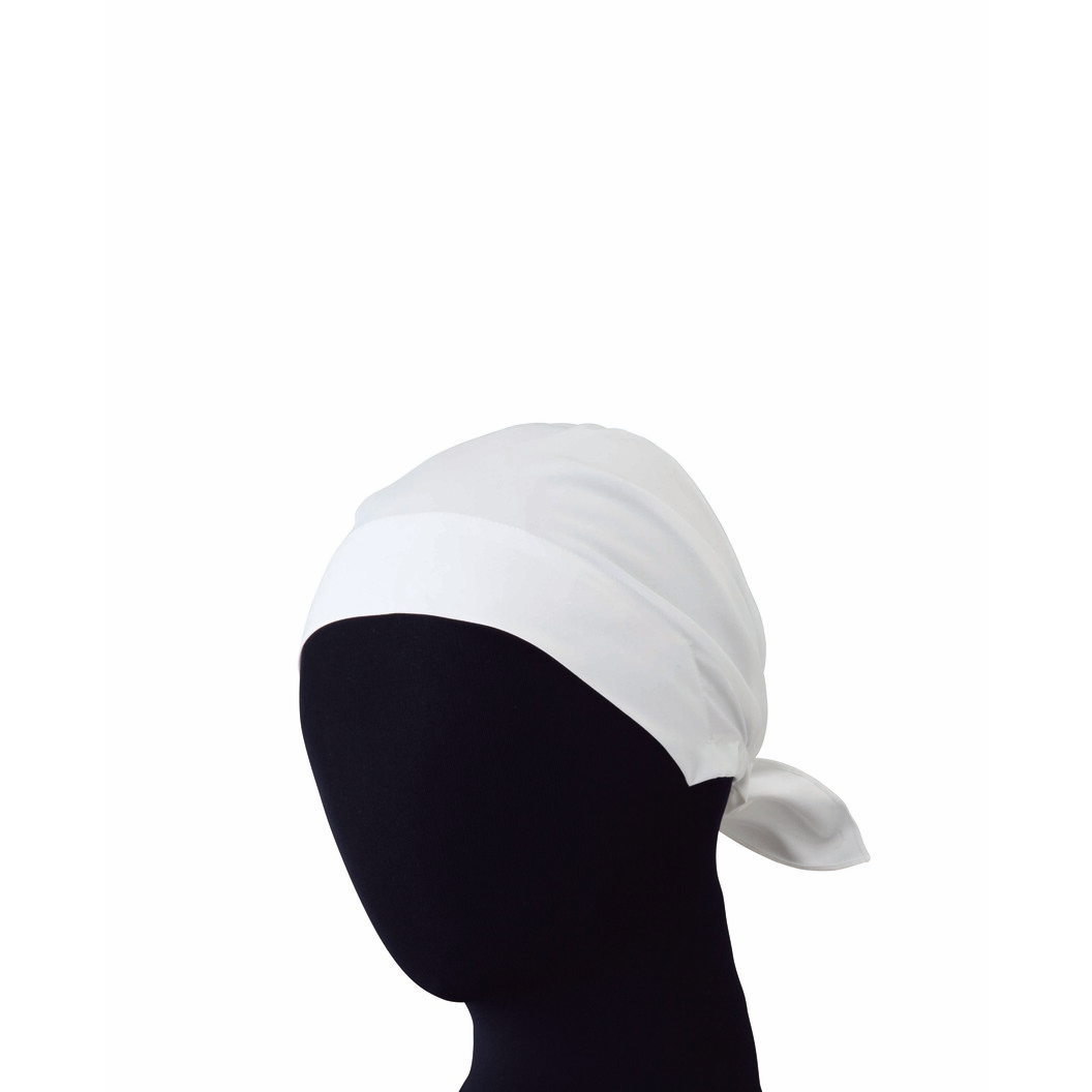 かたちになっていて後ろにゴムが入っているバンダナキャップですので、誰もが簡単に身に着けることが出来ます。生地はブロード、透け防止とUVカット機能あり。色は定番の白と黒の展開です。