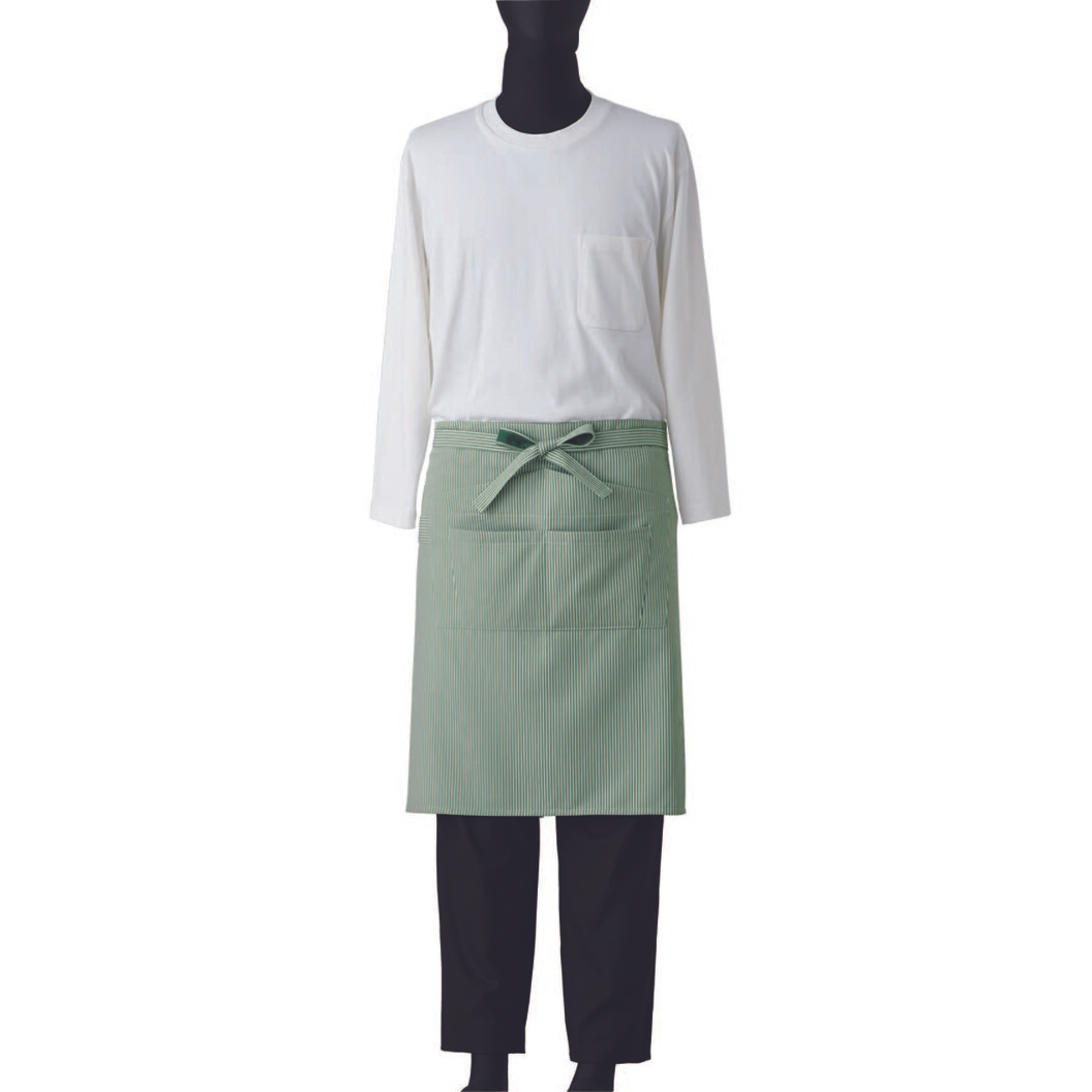 ワーキング、カジュアルで人気の綿素材ヒッコリーストライプをポリエステル高混率生地で作成しました。毎日ユニフォームとして使用、洗濯した際の色退色、生地の劣化などが綿より強くなり、きれいな状態のまま長く使用することが出来ます。全体的にはシンプルですがポケットを2段構造計3室にし、アウトドア感あるデザインにしています。上段のポケットはiPadも入る大きなポケットですので色々と収納出来ます。紐裏には滑り止めの為に配色異素材テープをたたきつけ、ほどけにくくかつ結んだ再に配色がデザインポイントにもなります。右サイドにはタオル等色々をかけるループ2つを施してあります。後ろ姿を美しくするため左後ろウエスト部分にボタンホールが1つあり、そこに紐を通して着用すれば紐がきれいに収まります。制電糸あり、ボトムにまとわりつく心配もなく埃も寄せ付けにくくなります。SRという汚れを落としやすくする加工も付加されています。