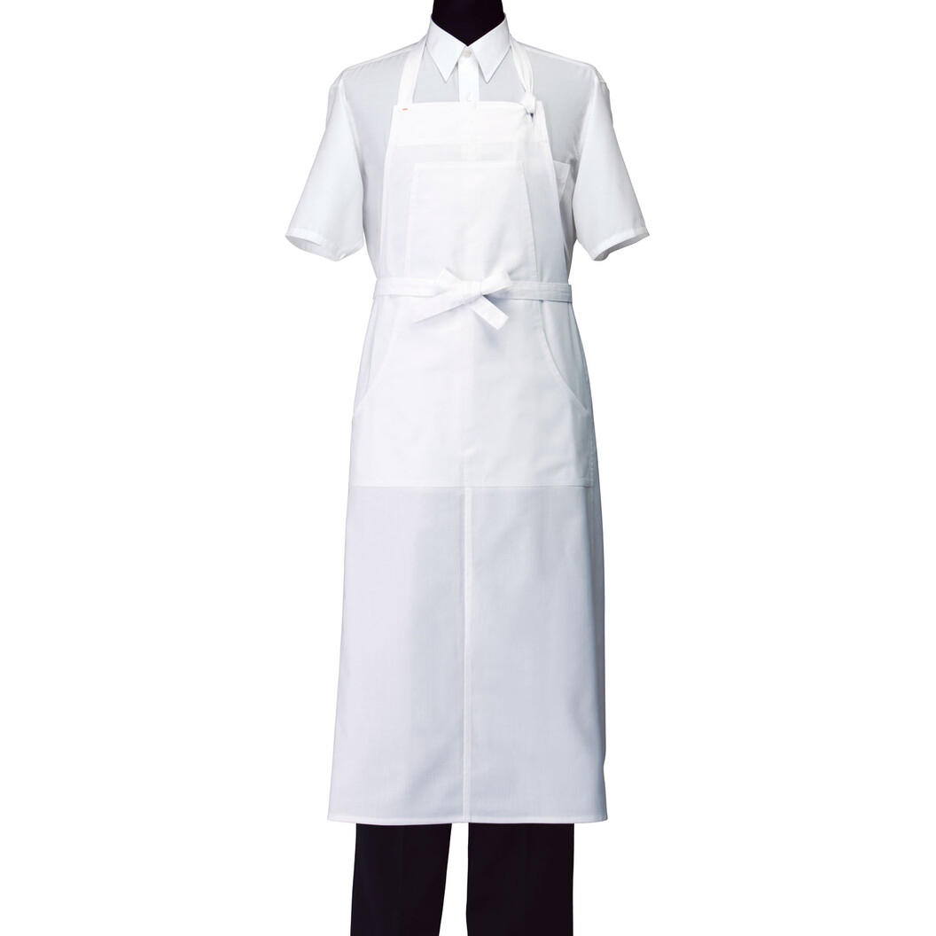 綿100%の生地に見えますが糸の芯にポリエステル糸が入っています。綿の肌触りを保ちながら強度が上がり、見え感は天然素材の綿そのもの、機能は吸水速乾があります。胸当てエプロンですが丈調節方法に少しコツが要ります。後ろのあて布に首紐を通し着丈調節するという方法で、その首紐を通す部分が狭く通しにくいことがあります。着用前にセットしておくことをオススメします。その後ろのあて布にお店のロゴを刺繍もしくはプリントなど施し、後ろ姿にもユニフォームらしさを表現出来る貴重なデザインになっています。ポケットは上1室、下1室構造です。色がアースカラーですので料飲サービスだけでなく物販サービスなどにも適しています。着丈がかなり長いのでご試着後の購入をオススメします。