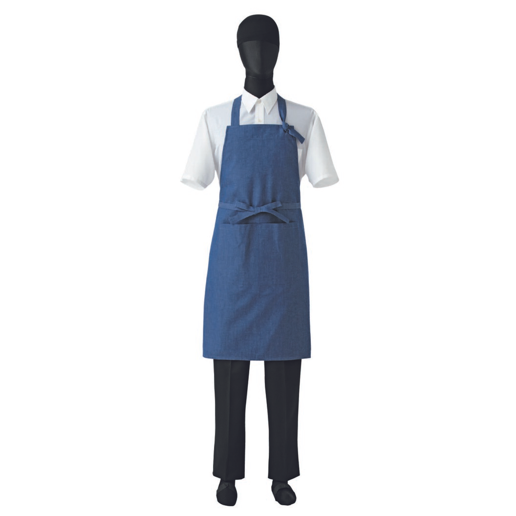 首掛けタイプの胸当てエプロンです。ポリエステルと綿の先染めデニム生地ですので、通常のデニムのような色の経年劣化はほとんどなく耐久性、洗濯性にも優れ、生地も薄めに作られていますので軽い着用感も得られる素材です。デニムのカジュアルな雰囲気を持ちながら、ホスピタリティーあるサービスを長く継続することが出来ます。デザインはとてもシンプル。色はライフスタイルに溶け込むインディゴ、カーキ色ですのでナチュラル感や自分たちの持つカルチャーや思いを表現したいシーンにさりげなく利用できるエプロンです。首掛け紐で多少のサイズ調節出来ます。