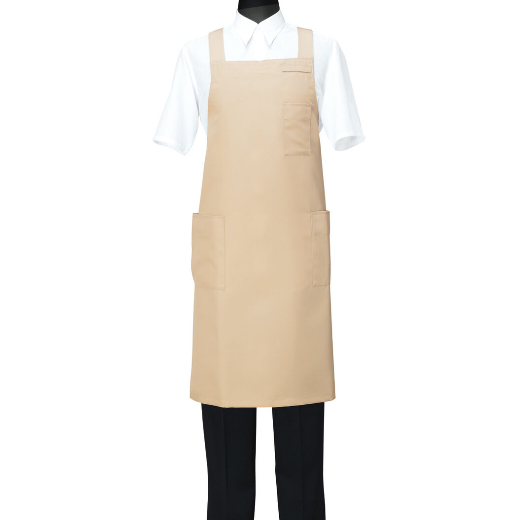 定番エプロンシリーズの1つ、胸当て後ろクロスエプロンです。胸当てエプロンの定番です。料飲、物販、清掃等と多くのシーンで使われています。生地はユニフォームらしく耐久性、洗濯性に富むポリエステル100%素材。制電糸入りすので埃も寄せ付けにくくなっています。ポケットは左胸に1つ、腰左右脇にマチ付きの容量の大きいものが付いています。ネームチーも付いていますのでエプロン生地を傷つけることなく誰もが同じ位置に名札を付ける事ができます。